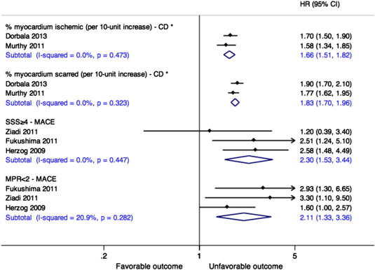 Fig. 2. Meta-analyses of associations of PET MPI measures with patient outcomes. Effect estimates are derived from multivariate analyses unless marked with * in which case estimates are derived from univariate analyses. Abbreviations: CD, cardiac death; CI, confidence interval; HR, hazard ratio; MACE, major adverse cardiovascular events; MPR, myocardial perfusion reserve; and SSS, summed stress score. |