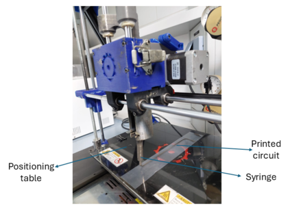 Both types of inks were printed using a BCN3D Plus 3D printer, equipped with a paste extruder module. A syringe attached to the extruder was used to deposit the conductive paths. The complete printing setup is illustrated in Figure 1. After printing, the nanoparticle-doped epoxy ink was initially cured at room temperature, followed by a post-curing step using Joule heating to enhance their mechanical and electrical properties [5]. The silver ink was sintered at 150 °C after printing.