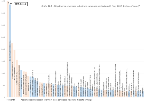 L’elevat grau de multinacionalització s’explica perquè en la pràctica totalitat de sectors industrials grans corporacions transnacionals han establert instal·lacions productives a Catalunya ( circumstància que indica una positiva capacitat per atreure inversions) i el resultat d’això és que trobem una forta presència de grans companyies de capital forà entre les de major dimensió de la indústria del Principat (veure gràfic 12.1).