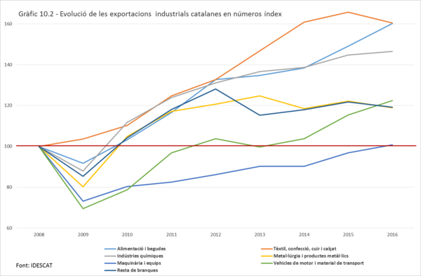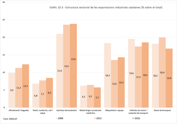 A Catalunya el 2008 els principals sectors exportadors eren el químic-farmacèutic, amb una participació del 21,0% en el total, el de material de transport (19,6%) i el de maquinària i equips (18,3%). És a dir, aquestes tres branques representaven aquell any gairebé el 60% de les vendes totals de la regió a l’exterior, el que indica una forta concentració -i per tant, dependència- de les exportacions catalanes d’aquestes activitats. I cal no oblidar que es tracta de sectors en els que té lloc una forta presència de companyies multinacionals per la qual cosa hom pot concloure que la dinàmica d’aquestes corporacions ha estat fonamental per explicat el bon comportament de les vendes a l’exterior al nostre país (veure gràfic 10.3).