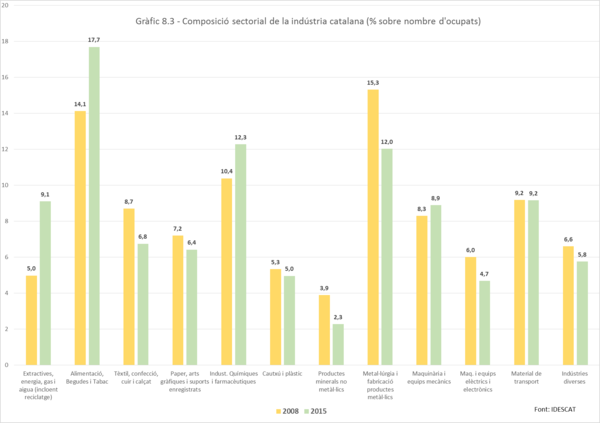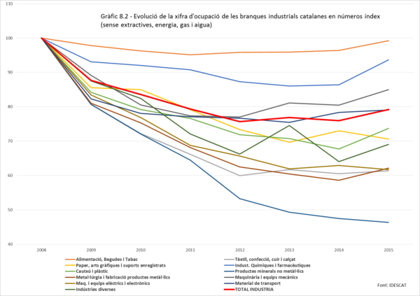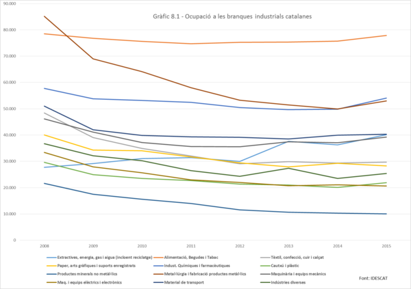 En mig d’aquesta regressió la branca que resisteix millor és la d’alimentació, begudes i tabac que en aquest període només perd 600 efectius i el 2015 passa a ser la capdavantera de la indústria per l’ocupació que genera, augmentant la seva participació del 14,1% al 17,7%. En canvi el sector de la metal·lúrgia i fabricació de productes metàl·lics, que se situava en primer lloc el 2008, pateix una forta recessió i perd 32.000 treballadors, i la seva participació en el total es redueix en 3,3 punts percentuals (del 15,3% al 12,0%), situant-se el 2015 en la tercera posició. En aquest any el segon lloc passa a ocupar-lo el sector químic-farmacèutic, que aportava més de 54.000 efectius (només en perd 2.700) i millora la seva participació en 2,9 punts percentuals (del 10,4% al 12,3%) (veure gràfics 8.1, 8.2 i 8.3).