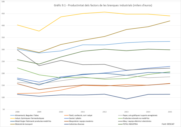 A nivell sectorial la mesura de la productivitat s’associa a la facturació per treballador doncs no es disposa de la informació del VAB amb la desagregació requerida en aquest treball. Les dades de xifra de negoci per treballador el 2008 reflectien diferències importants entre les diferents activitats industrials. El major registre corresponia a la branca més intensiva en capital, la de les activitats extractives, energia, gas i aigua, que s’apropava als 800.000 € per treballador (i que per raons d’escala no figura en el gràfic 9.1). En el grup dels sectors manufacturers, el químic-farmacèutic depassava els 400.000 € per ocupat i dos més, el de material de transport i el de l’alimentació, begudes i tabac se situaven lleugerament per sobre dels 300.000 €/treballador mentre que el de material elèctric i electrònic estava lleugerament per sota d’aquesta xifra. A partir d’aquí la productivitat cau de manera important i llevat la branca de minerals no metàl·lics, la resta presentava un registre per sota dels 180.000 € per treballador. Mantenint-nos dins del grup manufacturer és remarcable que la productivitat del sector amb un registre més alt, el químic-farmacèutic, fos 3,6 vegades superior al que presentava el que tenia un valor més baix, el de les indústries diverses, una circumstància que reflecteix les diferents característiques en cada cas: capital intensiu i amb personal qualificat el primer i treball-intensiu i emprant personal amb un menor grau de qualificació el segon (veure gràfic 9.1).