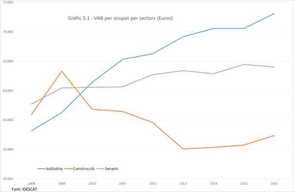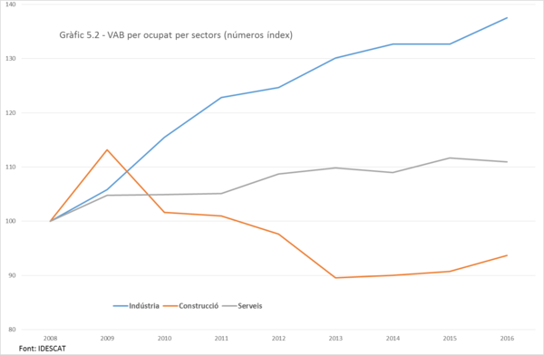 El 2008 el VAB per ocupat dels tres grans sectors era bastant semblant i oscil·lava des dels 57.700 € dels serveis (valor superior) fins als 53.200 € de la indústria (valor inferior), situant-se la construcció en una posició intermèdia (55.900 €). Al llarg del període 2008-2016 l’evolució de la productivitat per activitats presenta diferències significatives com a conseqüència del desigual comportament del PIB i de l’ocupació, i la branca que experimenta un comportament més favorable és la indústria quin VAB per ocupat augmenta ininterrompudament i el 2016 assoleix un registre de 73.100 €, una xifra un 37,5% superior a la del 2008 i que s’explica essencialment per la pèrdua de llocs de treball: el 2016, amb un 24,0% menys d’efectius el VAB industrial era un 4,6% més elevat (gràfics 5.1 i 5.2).