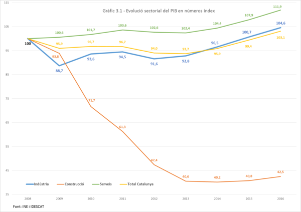 En comparació amb els altres dos macro-sectors, al llarg d’aquests anys la indústria presenta un comportament clarament més negatiu que els serveis -que és la branca que resisteix millor els embats de la crisi-, però força més favorable que el de la construcció. Així, el 2016 el PIB del sector terciari era un 11,8% superior al del 2008 mentre que el de la construcció pateix una davallada espectacular (-57,5%) (veure gràfic 3.1).