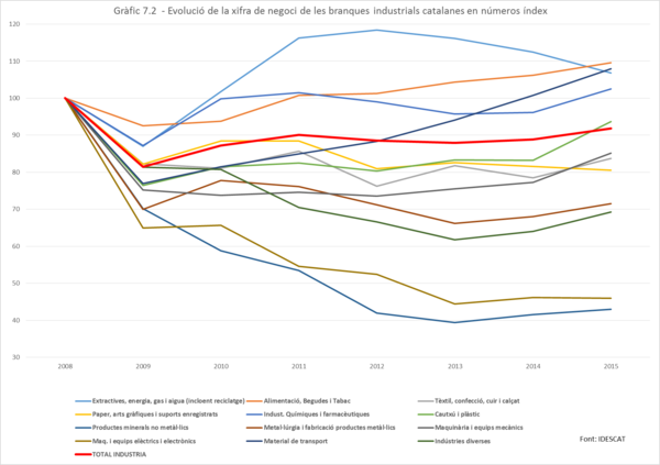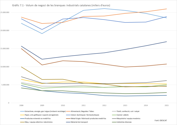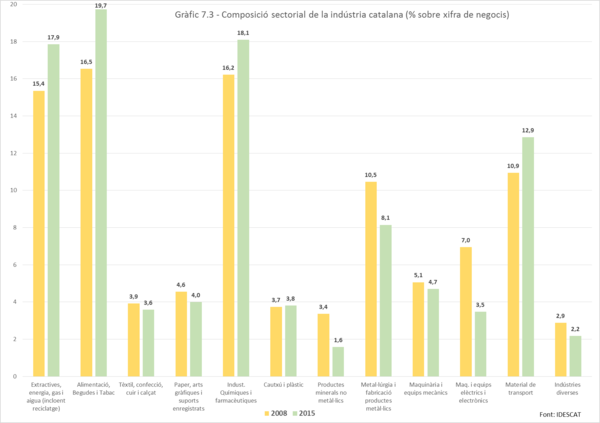Tot això mostra que el 2015 a la indústria catalana hi havia quatre branques que en termes de xifra de negoci i de facturació constituïen el seu “nucli dur”. Són les d’activitats extractives, energia, gas i aigua, l’alimentació, la química-farmacèutica i la de material de transport, que al llarg del temps han anat substituint sectors com el tèxtil, el metal·lúrgic i el de construcció de maquinària, que dècades enrere mantenien les posicions capdavanteres.