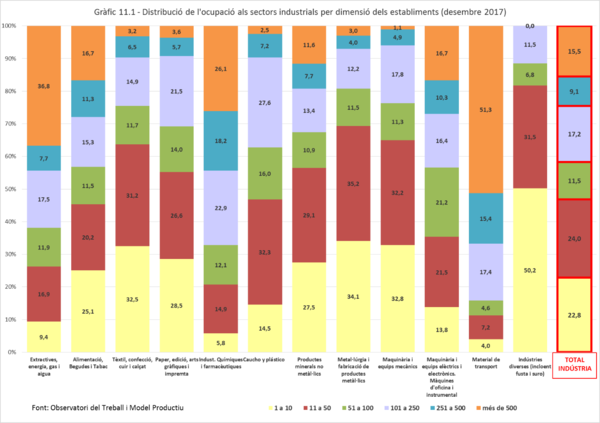 Un altre tret característic de la indústria catalana es que presenta un predomini de PIMES, a l’igual que succeeix en les altres regions de vella industrialització del sud d’Europa. Si observem la distribució de l’ocupació per segments, el desembre del 2017 (darreres dades disponibles) gairebé el 47% dels treballadors es trobaven en establiments de petita grandària, amb 50 o menys empleats, mentre que l’ocupació en els de gran dimensió (de 250 o més efectius) no arribava al 25%. Les mitjanes empreses (que són les que tenen una plantilla d’entre 51 i 250 treballadors), per la seva part, aportaven gairebé el 29% de l’ocupació total (veure gràfic 11.1).