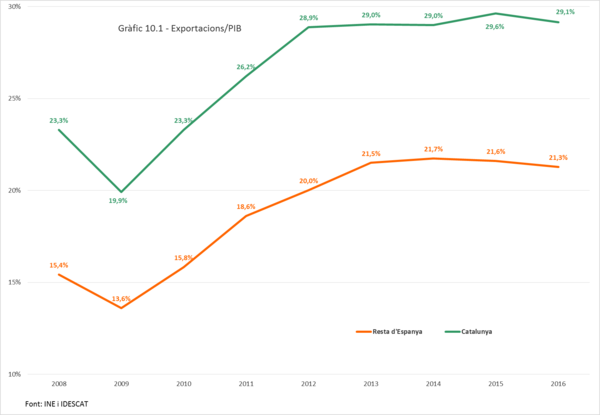 La favorable evolució de les vendes a l’exterior al llarg d’aquests anys també va comportar una millora del rati exportacions industrials/PIB, doncs l’augment de les exportacions ha estat clarament superior al del PIB en la majoria d’exercicis. Aquesta millora es concentra especialment en el període 2009-2012, amb un guany de nou punts percentuals (del 19,9% al 28,9%) per estabilitzar-se al voltant del 29% en els darrers quatre anys. Així, la participació de les vendes industrials catalanes a l’exterior en el PIB regional després d’enregistrar el mínim el 2009 amb un pes del 19,9%, augmenta ininterrompudament fins el 2015, assolint un registre del 29,6%, per experimentar un lleuger retrocés el 2016 (29,1%).