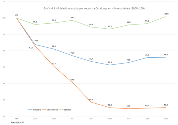 Una raó important d’això és que la indústria, a diferència dels serveis i la construcció, és una activitat intensiva en capital per la qual cosa les noves inversions tendeixen a crear pocs llocs de treball (i més en un context de canvi tecnològic accelerat en el que es tendeix a substituir mà d’obra per capital), i aquesta aportació d’efectius resulta insuficient per compensar les pèrdues que tenen lloc per tancaments i deslocalitzacions. Aquesta situació s’agreuja en la fase recessiva del cicle al ralentitzar-se les inversions i intensificar-se la desaparició d’empreses. Així, la indústria catalana pateix una forta davallada d’efectius, del 28,7%, entre el 2008 i el 2013, per remuntar de manera molt moderada els tres darrers exercicis. El 2016 l’ocupació industrial encara era un 24,0% inferior a la del 2008, el que reflecteix les dificultats per recuperar els llocs de treball perduts àdhuc en un context de contenció dels costos laborals. El 2016 el sector industrial català havia perdut quasi 184.000 efectius respecte l’any base.