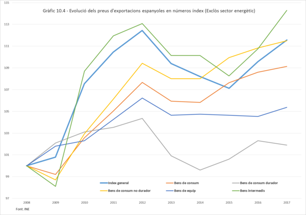 Aquí un fet remarcable és que el període de més creixement de les vendes industrials catalanes a l’exterior també es correspon amb el de major increment dels preus d’exportacions (2009-2012) i no és fins el 2013, justament quan es ralentitza la taxa de creixement de les vendes a l’exterior, que s’inicia una inflexió a la baixa en el comportament dels preus (veure gràfic 10.4), el que indica que la reducció de costos no s’ha traduït en una disminució general dels preus i per tant, no es pot atribuir de manera immediata i amb caràcter general a la contenció dels salaris la millora de les exportacions industrials en aquest període. Circumstància que no impedeix que ens casos concrets pugui existir una relació positiva i directa entre la contenció dels costos i els guanys en els mercats exteriors.