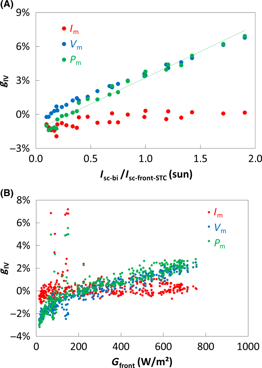 Using our setup, we ensured that all the IV parameters follow the same tendency independently of the illumination mode (frontside only, backside only, double side) and identified the resistive losses which increase when the module receives higher irradiance. Figure 6A shows that the power in double illumination (Pm-bi) gets lower than the linear tendency, which is the sum of frontside and backside powers (Pm-front + Pm-back) as the total irradiance on the module Isc-bi/Isc-front-STC increases. Figure 6B details this behavior plotting the gain between Pm-bi and (Pm-front + Pm-back). This shows that the resistive losses reach −5% at 2 sun. Note that for front characterization at low irradiances, the gain is actually positive because of the logarithmic behavior of the voltage (see the Vm parameter evolution in blue).
