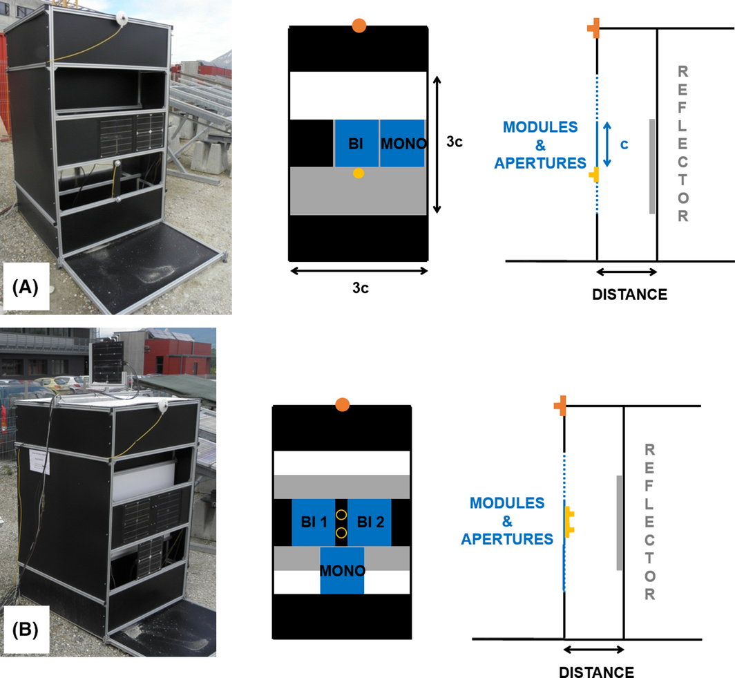Figure 7. Picture and schematics of our reduced scale test bench for studying the opto-geometrical parameters (A) and the module parameters (B). Filled orange circle denotes the front pyranometer CMP3, while the filled and empty yellow circles denote the SPlite pyranometers for front and rear, respectively. All pyranometers are installed vertically and front pyranometers face south. |