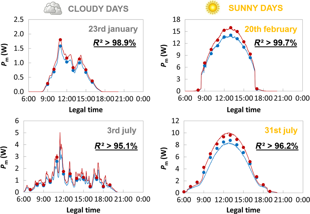 Figure 14. Comparison of simulated (dots) and experimental (curves) data for bifacial (red) and monofacial (blue) modules against legal time, with associated R2. Cloudy days on the left, sunny days on the right, winter days on the top, and summer days on the bottom. |