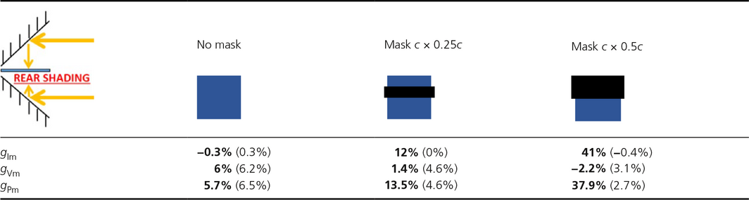 Table 2. Gains of the novel architecture compared to standard one for parameters Im, Vm and Pm for different shading configurations on the backside of the modules placed in our double illumination setup (see the image on the left corner). The measured gains (in bold) are compared with calculated gains taking into account resistive losses only (between brackets)