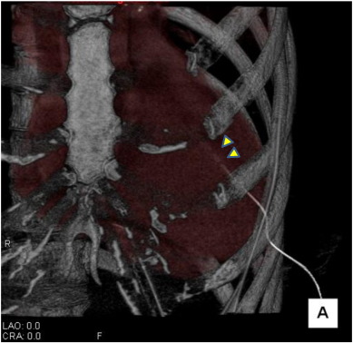 Fig. 2. Cardiac perforation revealed by non-contract 3-dimension computed tomography. The catheter has penetrated the anterior wall in the apex of her myocardium and the tip is present in the basal portion of her left ventricle cavity. The side holes in the catheter were all present in her left ventricle cavity (arrowhead). |
