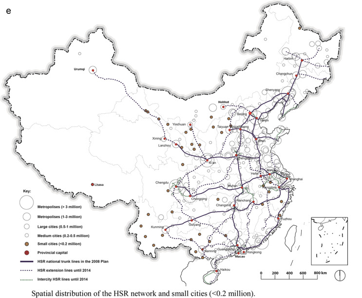 (a) Spatial distribution of the HSR network and metropolises (>3 million). (b) Spatial distribution of the HSR network and metropolises (1–3 million). (c) Spatial distribution of the HSR network and large cities (0.5–1 million). (d) Spatial distribution of the HSR network and medium-sized cities (0.2–0.5 million). (e) Spatial distribution of the HSR network and small cities (<0.2 million). Source: Elaborated by the author.