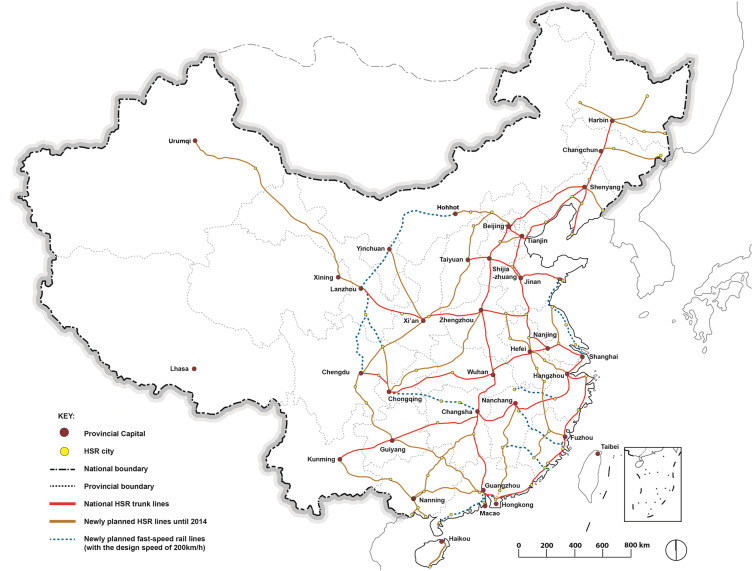 Figure 2 shows the spatial distribution of national HSR trunk lines, the newly planned HSR lines, and the fast-speed rail lines.4 Spatially, the newly planned HSR lines can be regarded as branches and extensions of the trunk lines or the linking lines among trunk lines. Therefore, we consider these newly planned HSR lines as the national HSR extensional lines.