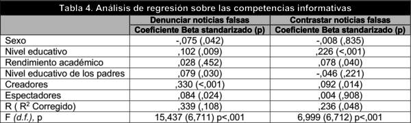 A continuación, se llevan a cabo dos análisis de regresión múltiple para averiguar cuáles son las variables que predicen estas competencias informativas. La Tabla 4 muestra las variables incluidas en el análisis. La primera ecuación toma como variable dependiente «denunciar», las variables incluidas en el análisis explican el 10,7% de la varianza (R2=,107, F6,711=15,437, p<,001). El sexo es estadísticamente significativo en la predicción de reportar noticias falsas: los hombres tienden a denunciar con más frecuencia las noticias falsas. En conjunto, el análisis de regresión muestra que pertenecer al perfil de los «creadores» es el factor más importante para predecir la reacción a las noticias falsas (β=,330, p<,001). Así mismo, los espectadores tienen un papel significativo y positivo en denunciar las noticias falsas, si bien el coeficiente obtenido es inferior al de los creadores (β=,084, p=,024).