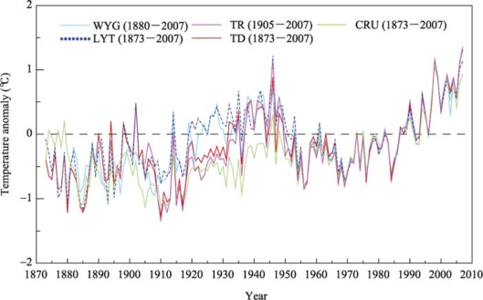 Figure 1 depicts the anomalies of the five Chinese series. All curves show similar values after 1951, though the data and methods employed are not exactly the same. It is also very apparent that the curves differ widely before 1950. For example, in the warm period of the 1920s–1930s, TR, CRU and TD show negative values compared with LYT and WYG. In addition, in the cold period of the early 20th century, TR, TD, and CRU curves are lower than LYT and WYG. This probably associates with the data and methods applied for calculating.