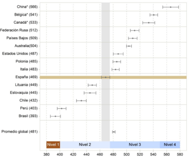 Los resultados obtenidos por España no son muy alentadores. España, con una puntuación de 469, se sitúa significativamente por debajo de la media del conjunto de los 15 países participantes (tanto de la OCDE como asociados), por lo que se sitúa en el décimo puesto en puntuación y competencia financiera entre los quince países y economías que realizaron el estudio y el octavo de los 10 países miembros participantes.
