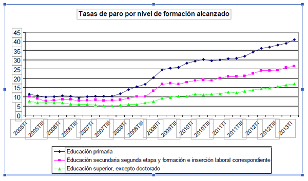 Además, este abandono temprano puede conllevar otras problemáticas asociadas como el desempleo que contribuya a hacer más vulnerable este colectivo. Desde el inicio de esta crisis el número de personas empleadas ha caído, pero no todos los grupos de educación han sufrido igual la caída, aproximadamente el 80% de las personas en situación de desempleo se concentró en personas con un bajo nivel educativo, equivalente a la Enseñanza Secundaria Obligatoria o menos. Por el contrario, el empleo de las personas con estudios superiores (titulados universitarios) han sido más resistente al periodo de crisis.