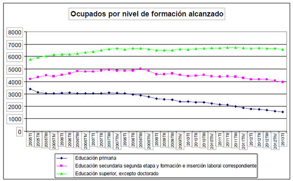 El resultado puede verse en los siguientes gráficos, obtenidos a partir de la EPA-Encuesta de Población Activa- del primer trimestre de 2013.