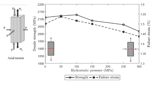 Additionally, the effect of hydrostatic pressure on the tensile failure of fibre reinforced composites is addressed and the generalized strength reduction with increased pressure is shown to be well captured by the models (Figure 2), however, no key differences were observed in the failure mechanisms.