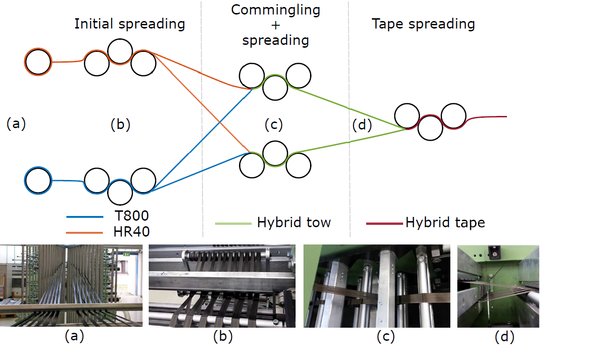 In this work, a strategy to manufacture intratow hybrid materials is also developed and implemented based on the spread-tow technology. T800, high elongation fibres, and HR40, low elongation fibres are used. An UD500 spreading machine from LIBA (now Karl Mayer Technische Textilien GmbH, Naila), at the Airbus Group Innovations Munich, Germany was used. The machine can produce UD tapes up to 500mm wide and combines coated spreading bars with the possibility of adding vibration and temperature to spread the fibres. The machine is divided in three spreading stages (Figure 7). In the first stage, the non-hybrid tows are spread to lower tow thicknesses to improve the commingling process. In the second stage a hybrid tow is formed by overlapping and combing the previously spread non-hybrid tows. Finally, in the last stage, the hybrid tows are combined to create a hybrid tape, which is later infused to produce a composite plate.