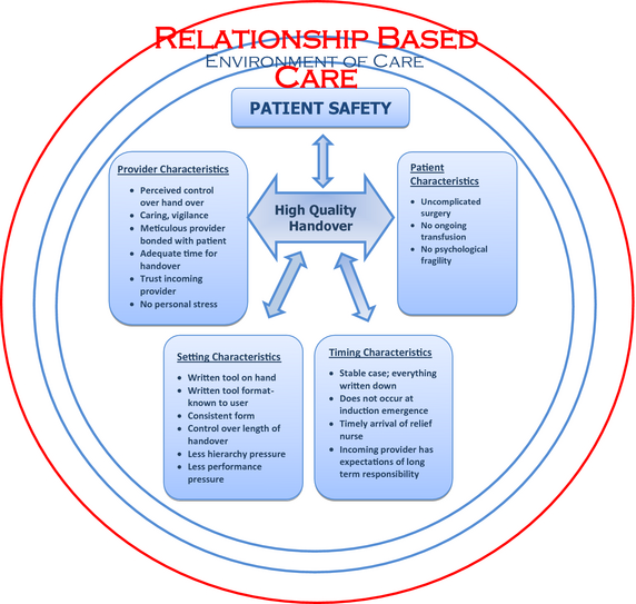 Figure 1. Model of Relationship-Based Care, patient safety and high-quality handovers of care; derived from interviews with nurse anaesthetists. |