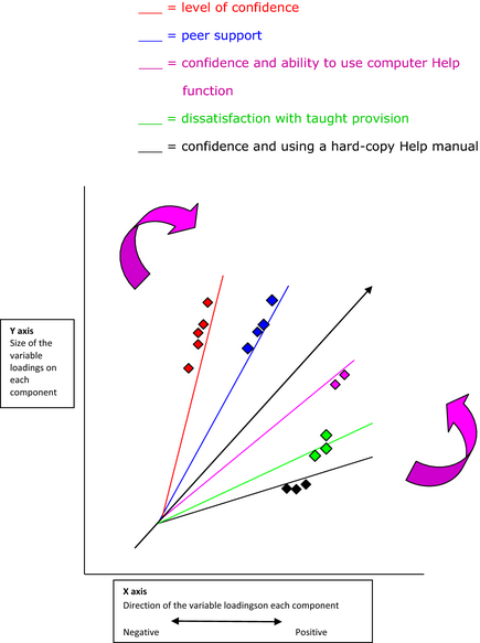 Figure 2 is a cross-section of a geometrical overview for the first five components. The loadings have been placed to approximately represent the figures in Table 2. Using an oblique rotation, Figure 2 shows the relationship between each component and its variables. The X-axis shows the direction of the variable loadings (positive or negative) on each component. The Y-axis reflects the size of the variable loadings on each component. Figure 2 shows clusters of several variables at midline and far out on each component. Higher loadings are the furthest away from the origin. The lowest loadings are the nearest to the point of origin. Both are indicative of reasonably and well-defined components (Field 2009). As the diagram shows the first five components, the space has five axes and five dimensions, and each observed variable is positioned by five co-ordinates. The clusters also show the closeness of the variables and the shared variance between them. The oblique rotation allowed the components to correlate. This showed where the variables correlated with one component through indirect correlation with another component.