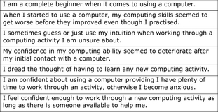 The two medium to high loadings reflect competence and confidence in following and applying written hard copy ICT instructions. The removal of Q26 ‘Sometimes I can complete certain computing activities without even having to think about them’ marginally improved the Cronbachs alpha = 0·554.