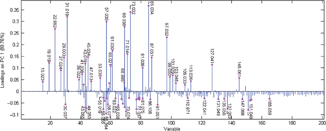 Figure 8. PC1 loading for the PCA model representing ToF-SIMS spectra of extracted red pine, holocellulose, and cellulose fractions. Reprinted (adapted) with permission from Goacher et al. [13]. Copyright (2011) American Chemical Society. |