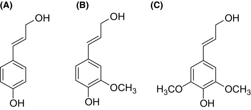 Figure 4. Three monolignol: (A) p-coumaryl alcohol, (B) coniferyl alcohol, and (C) sinapyl alcohol. |