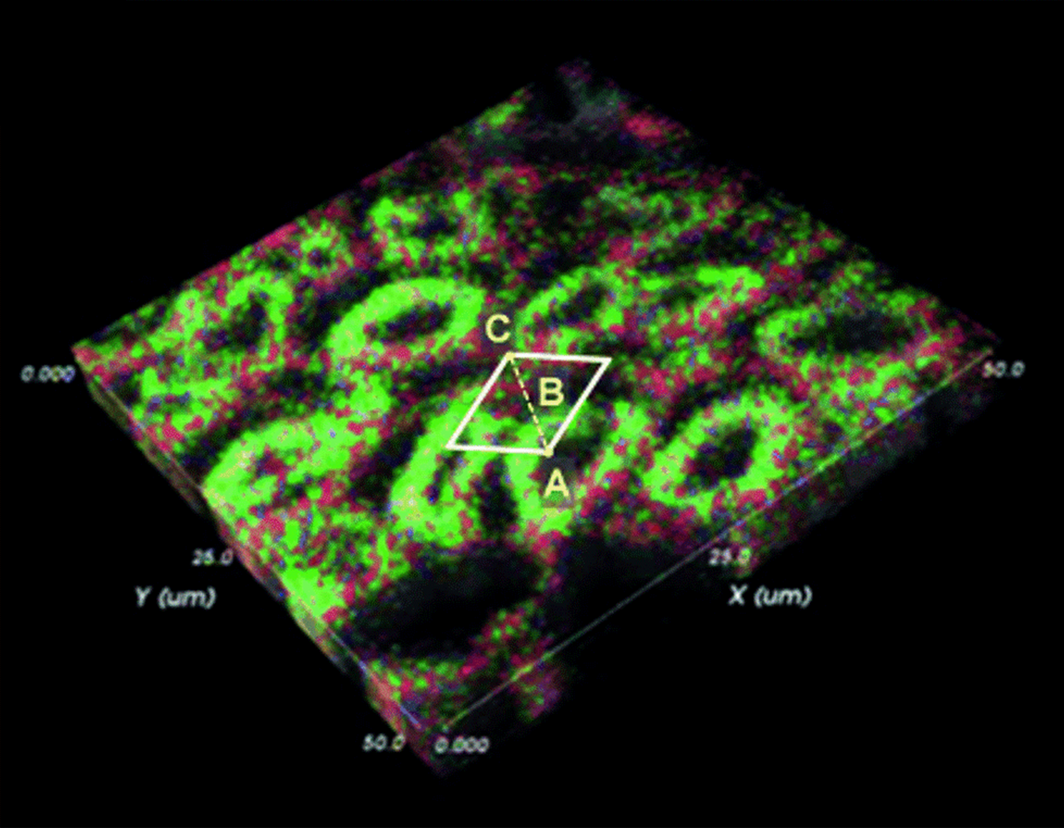 Figure 3. Time-of-flight secondary ion mass spectrometry 3D image of poplar tension wood stem cross-section, where cellulose (green pixels) and lignin (red pixels) are spatially distributed. The square edges are 50 μm long and the image is composed of 30 2D images stacked. Reprinted (adapted) with permission from Jung et al. [24]. Copyright (2012) John Wiley & Sons, Inc. |