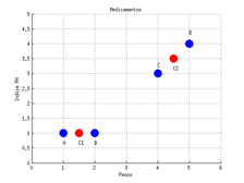 Para encontrar los grupos se calcula las distancias de los datos a los centroides y , tomando la distancia mínima para asignarlos al centroide más cercano.