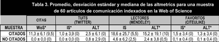 Por tanto, hasta el momento en la literatura científica no queda demostrado convincentemente que ninguna de la altmetrics correlacione con el número de citas, aunque sí existen evidencias de cierta asociación entre artículos altamente citados o descargados y altamente twiteados. Por ejemplo Eysenbanch (2011) al aislar de su muestra 55 artículos altamente citados reveló que en el 75% de los casos eran también altamente twiteados, llegando a alcanzar un coeficiente de correlación de 0,69, el más alto calculado hasta el momento. También Shuai, Pepe & Bollen (2012), al trabajar con una muestra de pre-prints depositados en ArXiv observaron que los trabajos que son tempranamente difundidos a través de Twitter tienen unos niveles de descargas más intensos. En nuestro caso la muestra de los más citados (tabla 3) era también la que tenía mayores tasas de actividad en las redes sociales.