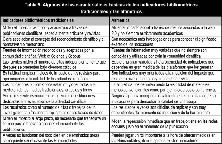 En el presente trabajo se realiza una revisión de las altmetrics o indicadores alternativos. Este concepto se define como la creación y estudio de nuevos indicadores, basados en la web 2.0, para el análisis de la actividad científica y académica. La idea que subyace es que, por ejemplo, las menciones en blogs, el número de tuits o el de personas que guardan un artículo en su gestor de referencias puede ser una medida válida del uso y repercusión de las publicaciones científicas. En este sentido, estas medidas se han situado en el centro del debate de los estudios bibliométricos cobrando especial relevancia. En el artículo se ilustran en primer lugar las plataformas e indicadores principales de este tipo de medidas, para posteriormente estudiar un conjunto de trabajos del ámbito de la comunicación, comparando el número de citas recibidas con sus indicadores 2.0. Los resultados señalan que los artículos más citados de la disciplina en los últimos años también presentan indicadores significativamente más elevados de altmetrics. Seguidamente se realiza un repaso por los principales estudios empíricos realizados, deteniéndonos en las correlaciones entre indicadores bibliométricos y alternativos. Se finaliza, a modo de reflexión, señalando las principales limitaciones y el papel que las altmetrics pueden desempeñar a la hora de captar la repercusión de la investigación en las plataformas de la web 2.0.