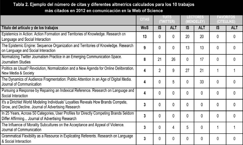 Taking into account the impact of Web 2.0 and its now central position within communication research, this paper undertakes a review of altmetrics, focusing on quantative studies of the same. Firstly, an explanation is given of the main platforms and indicators, followed by the comparative evaluation of a selection of communication papers showing the number of citations received and their 2.0 indicators. Next, a review of the principal empirical studies is undertaken, centering on the correlations between bibliometric and alternative indicators. To conclude, the main limitations of altmetrics are highlighted alongside a reflective consideration of the role altmetrics may play when it comes to understanding the impact of research in Web 2.0 platforms.