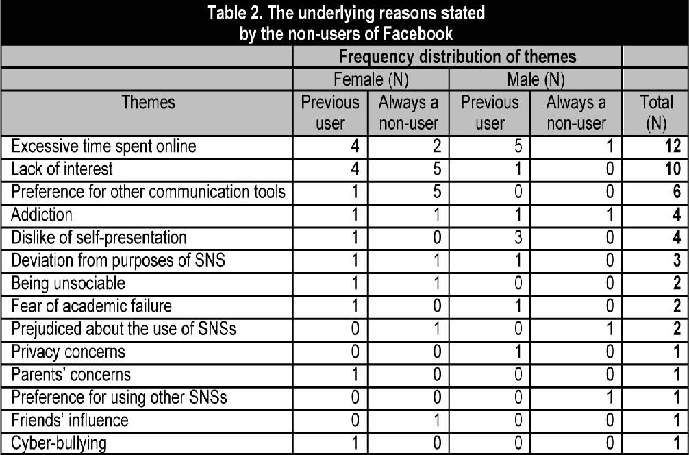 The three least commonly reported reasons for not using Facebook were preference for using other SNSs, friends’ influence, and cyber-bullying. One student stated, «The reason for deactivating my Facebook account is tending to use Twitter more than Facebook» (P6, Male). Another student said, «I suspended my account, because nonsense messages are coming consistently. I felt depressed. I am very comfortable right now» (P8, Female).