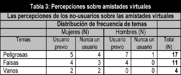 La mayoría de estos alumnos creyeron que las amistades virtuales son o peligrosas o falsas. Además, a veces afirmaron que las amistades virtuales son insignificantes y solamente seguras en parte. De modo parecido, Tufekci (2008) descubrió que los no-usuarios generalmente piensan que mantenerse en contacto con sus amigos por medio de los SRS es absurdo y no tiene sentido. Los investigadores han encontrado que algunos adolescentes prefieren interactuar directamente por teléfono o por encuentros dirigidos cara-a-cara en vez de por la comunicación en línea (McCown, Fischer, Page, & Homant, 2001; Wolak, Mitchell, & Finkelhor, 2002). Esto es importante cuando se consideran los usos de los SRS para entablar nuevas amistades y expandir el ambiente social propio. Por lo tanto se puede concluir que, para estos alumnos, los SRS no solo son un recurso insignificante para entablar amistades sino también un medio vano y peligroso para tales intercambios.