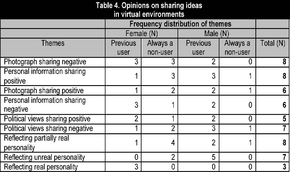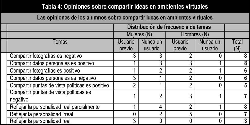 Las dos respuestas más comunes entre los alumnos con respecto a sus opiniones sobre compartir ideas, datos personales, y fotografías fueron negativas en cuanto a «Compartir fotos» (n=8) y positivas en cuanto a «Compartir datos personales» (n=8). Otras opiniones reportadas por lo común fueron negativas referente a «Compartir puntos de vista políticos» (n=7), y que el sitio o «Refleja [su] personalidad real parcialmente» (n=8) o «Refleja [su] personalidad real» (n=3). La distribución de la frecuencia de las respuestas a esa pregunta se presenta en la tabla 4. Un alumno dijo: «Creo que compartir fotos es la situación normal… pero los puntos de vista políticos no se deberían mencionar en este sitio» (P16, hombre). Al contrario, otra alumna respondió: «No veo ningún problema en compartir los puntos de vista políticos, aunque compartir los datos personales puede lastimar a los demás» (P7, mujer).