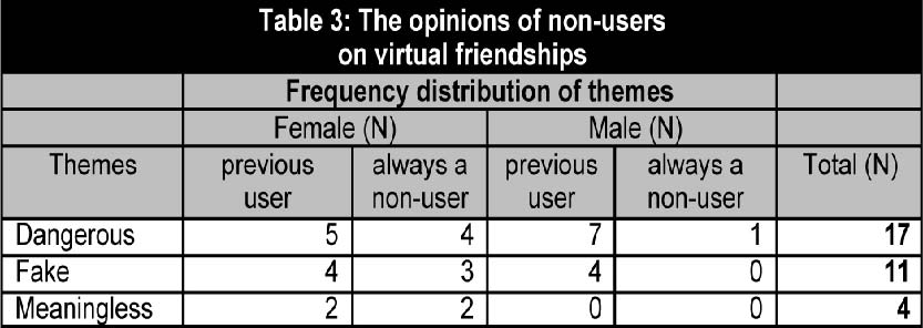 The majority of these students believed that virtual friendships are either dangerous or fake. Further, they sometimes stated that virtual friendships are meaningless and only partially safe. Similarly, Tufekci (2008) found that non-users generally think that keeping in touch with existing friends on SNSs is nonsensical and meaningless. Researchers have found that some teens prefer interacting directly through the telephone or with face-to-face encounters rather than by online communication (McCown, Fischer, Page, & Homant, 2001; Wolak, Mitchell, & Finkelhor, 2002). This is important when considering uses of SNSs for making new friends and expanding one’s social environment. Therefore, it can be concluded that, for these students, SNSs are not only an unimportant resource for friendships, but also a meaningless and dangerous medium for such interactions.