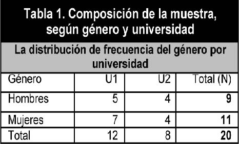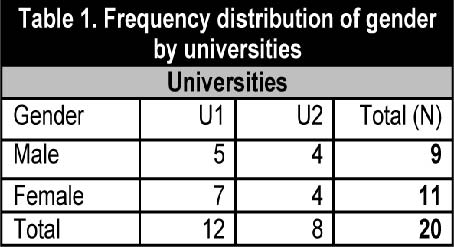 Se recogieron los datos de 20 alumnos de licenciatura, de entre 18 y 25 años, de las facultades de Informática Educativa y Tecnología Instructiva (CEIT), en dos universidades distintas de Turquía. Una de la universidades está localizada en la región este del país y la otra en la noreste. Todos los alumnos que participaron en esta investigación lo hicieron voluntariamente y recibieron un rotulador de CD por su participación. Los participantes fueron seleccionados por muestreo intencional, que es un método conocido en el campo de investigación cualitativa (Patton, 1990). Como indica la tabla 1, el grupo estuvo formado por un total de 11 mujeres y 9 hombres.