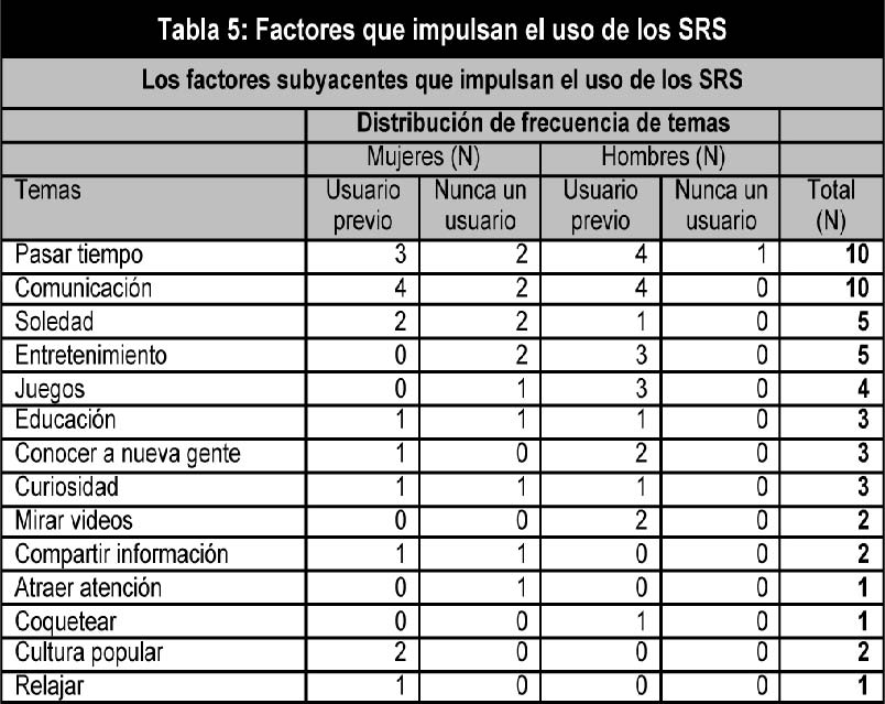 Cuando se les preguntó por los factores que impulsan a la gente a usar los SRS, las dos respuestas más populares fueron «Pasar el tiempo» (n=10) y «Comunicarse» (n=10). La distribución de frecuencia de las respuestas a esta pregunta se representa en la tabla 5. Un alumno indicó: «Creo que los usuarios de Facebook usan [el sitio] para aumentar el tiempo de ocio con sus amigos y pasar un buen rato» (P16, hombre). Otra alumno dijo: «Curiosidad y Entretenimiento… Creo que usan [el sitio] por eso» (P13, mujer).