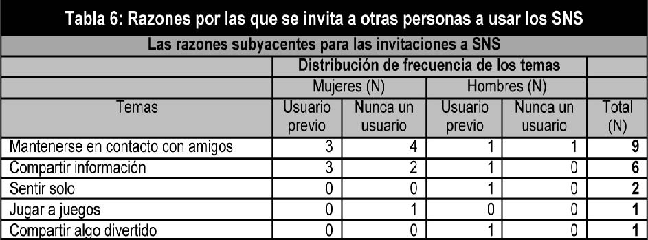 Cuando se les preguntó por qué hay personas que invitan a otras a usar Facebook, las dos respuestas más populares fueron «Mantenerse en contacto con amigos (n=12)» y «Compartir información (n=6)». La tabla 6 muestra las razones subyacentes para las invitaciones a SNS.