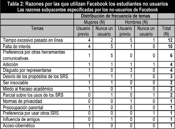 Ninguno de los participantes (n=20) estaba usando Facebook durante la recogida de los datos. Se les preguntó a los alumnos cuáles fueron los factores que les llevaron a ser no-usuarios de este SRS. Los resultados se presentan en la tabla 2.