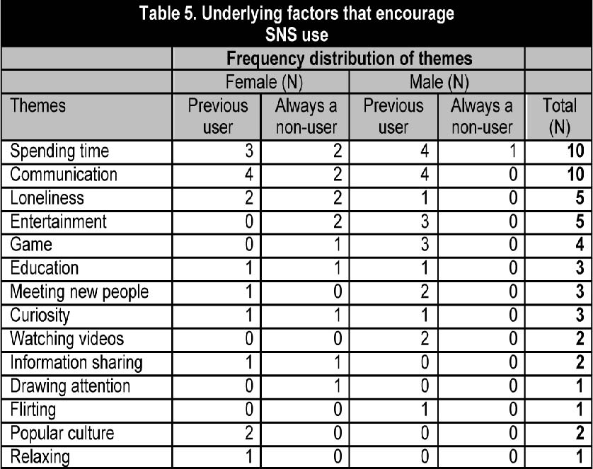 When asked to predict what factors encourage people to use an SNS, the two most popular responses were «Spending time» (n=10) and «Communication» (n=10). The frequency distribution of responses to this question is presented in table 5. One student reported, «I think Facebook users use [the site] to increase enjoyable time with friends and to have a good time in their free time» (P16, Male). Another student said, «Curiosity and entertainment… I think they use [the site] for them» (P13, Female).