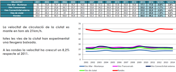 Il·lustració 5 – Evolució de la velocitat de recorregut en vehicle privat. Font. Dades Bàsiques de Mobilitat 2014, Ajuntament de Barcelona juliol 2015