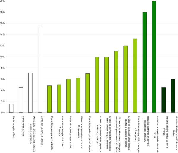 El 15% es troba en l’ordre de magnitud del diferencial de preus de sostre immobiliari entre edificis situats en carrers estàndard, i edificis situats en carrers destacats per ser carreres pacificats de trànsit viari (pe. Enric Granados), o per trobar-se davant d’un parc (pe. immobles situats a la vora del Parc Joan Miró, o per tenir vistes (pe. edificis singularment alts al centre de la ciutat), com es pot observar a la següent figura a partir de diferents estudis al món. .