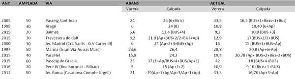 La següent taula mostra una selecció de projectes de reurbanització de carreres de Barcelona que han significat una disminució de capacitat viària, des de finals dels anys 1990. En aquests projectes, l’espai de voreres dels carrers ha augmentat entre un 20% i un 80% depenent del cas (metres de secció de vorera). I l’espai per cotxes ha disminuït. Al Passeig de Sant Joan, per exemple, es perd un 40% de secció de calçada i passa de 6 carrils per cotxes a 2 carrils; el carrer Aragó perd 2 carrils de circulació dels 8 que tenia; Balmes en perd 1 dels 4 que en tenia; l’Avinguda Madrid perd 2 dels 5 carrils per cotxes que tenia; i el carrer Pere IV passa de 5 carrils de circulació a només 1.