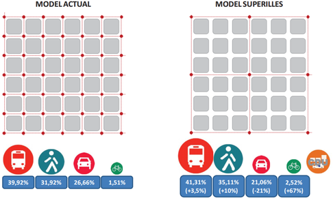 La proposta de Superilles, inclosa al PMU 2013-2018 pretén accelerar la creació de nous espais pacificats restringint el pas dels cotxes. La implementació de totes les superilles previstes suposarà passar de 75 ha a 750 ha d’espais d’estada on el vianant i la bicicleta tindran prioritat. Aquest sòl s’obtindrà de la reducció dels espais de circulació. Aquesta millora de l’habitabilitat dels carrers interiors permetrà al ciutadà realitzar trajectes a peu amb millors condicions, promovent aquest mode de desplaçament.